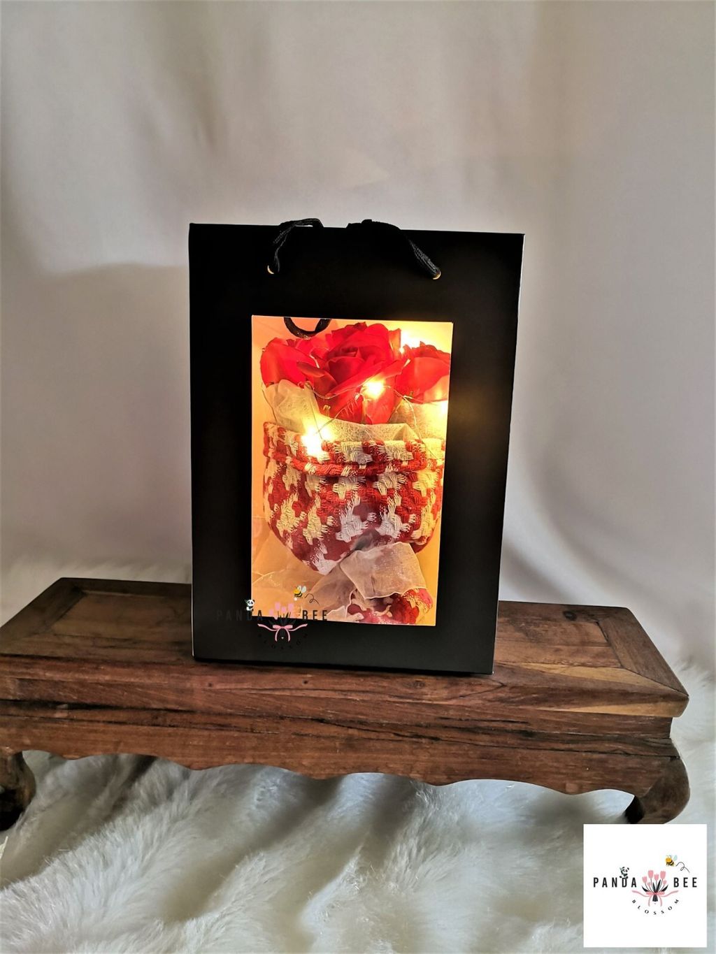 mini fabric wrapping 5 soap roses bouquet come with LED light, paper bag and a wishing card