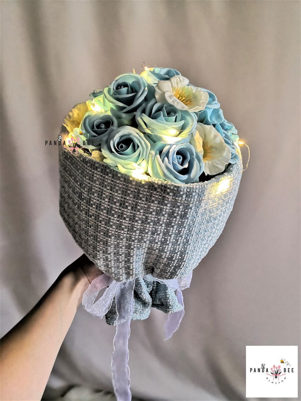 Bouquet include 15 soap roses with fabric wrapping, LED fairy light and wishing card