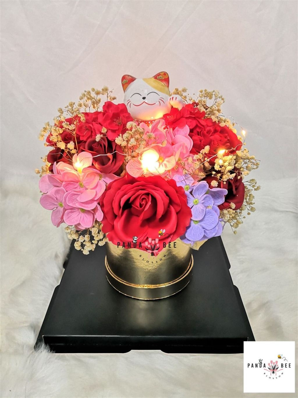 The product includes a fortune cat, various soap flowers, baby breath, LED fairy light, cylinder box, transparent box and wishing card.